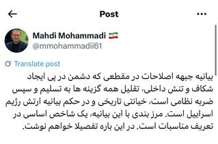 مهدی محمدی: بیانیه را «خیانتی تاریخی» و معادل بیانیه ارتش رژیم اسرائیل توصیف کرد.