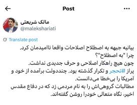 مالک شریعتی: بیانیه را «ناامیدکننده»، فاقد راهکار عملی و پر از تحجر و تکرار گذشته دانست.