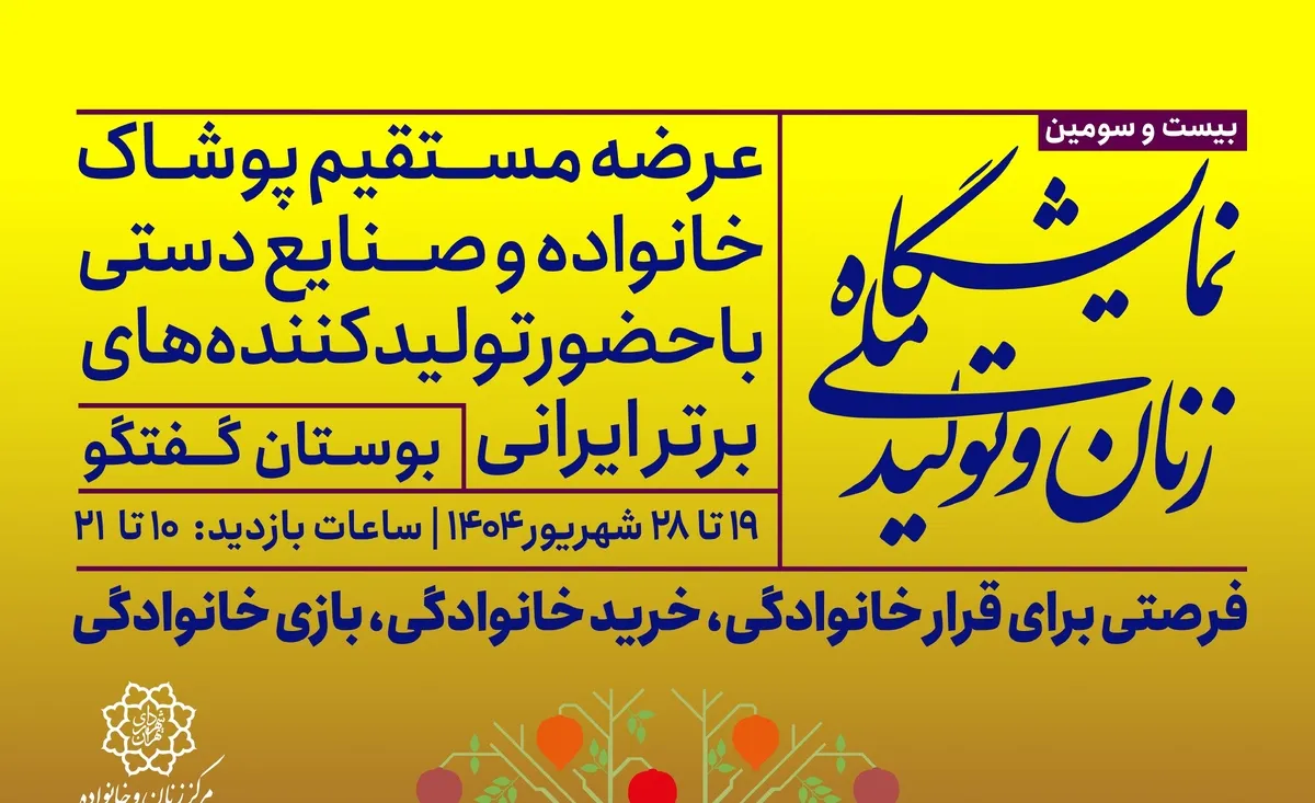 گفتنی است بیست و سومین نمایشگاه زنان و تولید ملی از ۱۹ شهریور تا ۲۸ شهریور ماه از ساعت ۱۰ صبح تا ۹ شب در محل دائمی نمایشگاه بوستان گفتوگو میزبان شهروندان تهرانی است.